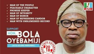 In 2018, Asiwaju Munirudeen Bola Oyebamiji (AMBO) was running to become Osun governor, to succeed Ogbeni Rauf Aregbesola, whom he had served from June 2017 as Commissioner for Finance, before he was confronted with the fact that Alhaji Adegboyega Oyetola had been anointed as the Candidate of the All Progressives Congress. He dropped his governorship ambition without malice. He collapsed his structure to support the Candidate of the party.