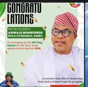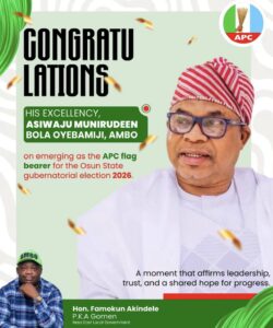 I extend my warmest and most heartfelt congratulations to His Excellency, Asiwaju Munirudeen Bola Oyebamiji (AMBO) on your emergence as the flag bearer of the All Progressives Congress (APC) in the Osun State gubernatorial election.