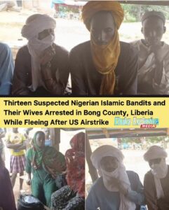 Thirteen suspected undocumented Nigerian Islamic militants, along with their wives, were arrested in Bong County, Liberia, while attempting to flee following a US airstrike.
